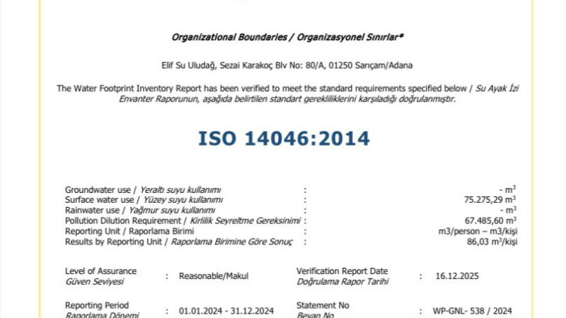 Suyu yalnızca tüketen değil, ölçen, yöneten ve geleceğe taşıyan bir anlayışla hareket ettiklerinin altını çizen Başkan Uludağ şu ifadeleri kullandı “Günümüz Türkiye’sinde suyun stratejik bir kaynak olduğunu ve iklim değişikliği, kuraklık ve artan nüfus baskısı altında suyu korumanın artık bir zorunluluk haline geldiğini göz ardı etmemeliyiz. Bu çalışma ile su kullanımının çevresel etkileri bilimsel verilerle ortaya konuldu. ISO 14046 Su Ayak İzi Belgesi, bu çevreci vizyonumuzun uluslararası düzeyde tescillenmiş halidir. Yaptığımız bu çalışmayla bizler çevre politikalarımızı söylemlerle değil, ölçülebilir ve şeffaf verilerle şekillendiriyoruz. Attığımız her adımda gelecek nesillerin hakkını gözetiyoruz” ifadelerini kullandı